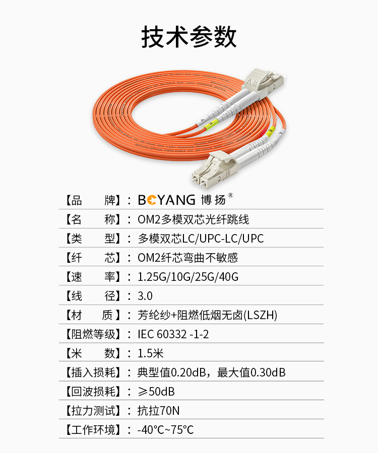 博揚(yáng)(BOYANG)電信級(jí)光纖跳線lc-lc(UPC) 15米 OM2多模雙芯雙工跳纖光纖線 收發(fā)器尾纖BY-15552MM,工程/企業(yè)采購精選,阻燃低煙無鹵,插損小于0.2dB,回?fù)p大于50dB,高速數(shù)據(jù)中心機(jī)房專用,支持定長定制(精確到0.1米)